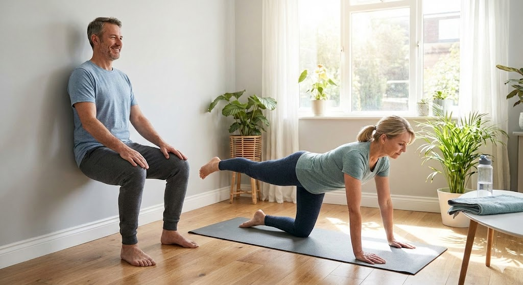 - 벽 스쿼트(Wall Squat): 무릎의 수호신 일반 스쿼트는 중심을 잘못 잡으면 하중이 무릎 연골에 집중됩니다. 하지만 등을 벽에 대고 미끄러지듯 내려가는 벽 스쿼트는 체중을 벽과 분산시키면서도 허벅지 대퇴사두근에 강력한 자극을 줍니다. 무릎을 90도까지 굽히기 어렵다면 45도만 굽힌 상태에서 30초간 버티는 것부터 시작하세요. 이는 관절 주변 근육을 강화해 통증을 줄여줍니다.